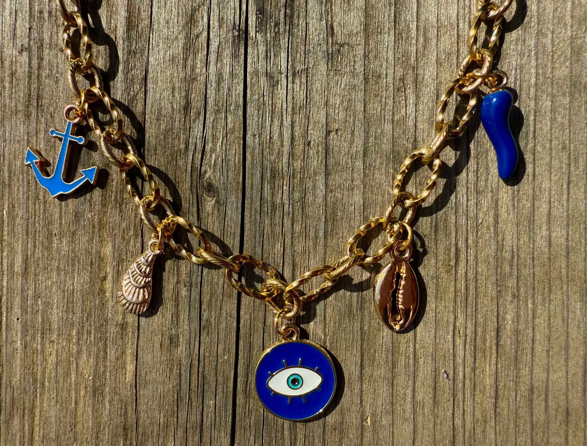 Avec ses charms — oeil protecteur, coquille diré, encre bleue émaillée, coquillage cauri doré et corne porte-bonheur ce collier te plonge dans un univers pop, doux et décalé.